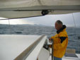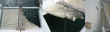 Was wir sahen verschlug uns die Sprache: In Fetzen hing das Trampolin zwischen den Rümpfen, die Metallteile der Befestigung schlugen auf Deck und die zerrissenen Tampen tanzten tollwütig umher. Eine beißende, salzige Flut riss uns aus der Erstarrung. Wir mussten unter Landabdeckung gehen um den Schaden zu sichten. Eine halbe Stunde kann eine Ewigkeit sein.