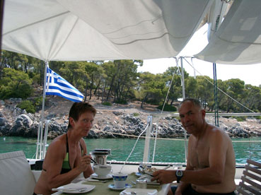 Wir liefen aus bei strahlendem Sonnenschein, bei schwachem Wind und freundlichen Wellen, gestärkt von griechischem Wein, Oliven, Käse und Brot.
