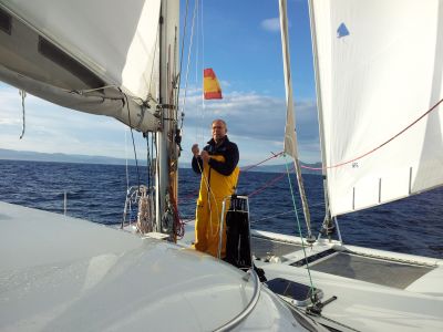 Prinzipiell ist die Nachtwache auf unserem Catamaran viel angenehmer als auf einem Einrümpfer, da man sich im Wesentlichen im warmen, trockenen Salon aufhalten kann und nur einen kurzen Blick zur Seite werfen muss, um Radar und Karte kontrollieren zu können…gälte es nicht, diese Unzeit und das doch massive Bedürfnis nach Schlaf zu überwinden.