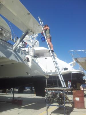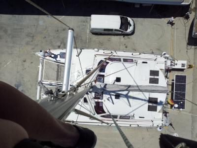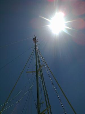 2. Zwei Bäume, zum Ausbaumen der Passatsegel sind evtl. nicht erforderlich, da die Segel – durch Peters pfiffige Sonderkonstruktion – recht gut stehen. Der nach vorne versetzte Holepunkt der Fock hält das Schothorn unten, das zusätzliche Anbringen der außen geführten Spi-Schoten zieht die Segel nach außen…