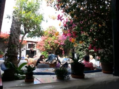 Der von Bougainvilleas überwucherte Patio einer Bodega in Teguise, wo jeden Sonntag der größte Markt der Insel stattfindet…