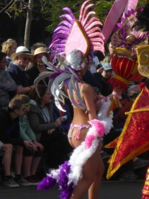 Wir haben den Eindruck, dass – abgesehen von Steinalten, Schwachen und Kranken – ganz Santa Cruz beteiligt ist. Ballett-, Rollschuh-,Turn-, Tanz-, Samba- und Seniorengruppen schwingen und tanzen zu den heißen Rhythmen der Trommler und Musikvereine durch die Straßen.