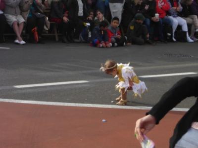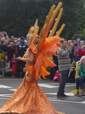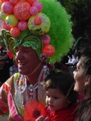 Wir stehen leider in der 4. oder 5. Reihe und müssen es der Kamera am hochgereckten Arm überlassen, welchen Schnappschuss sie nimmt. Von den prunkvollen ersten drei Wagen erwischt sie hier den Zipfel eines Federbusches, dort ein paar filigrane Blütenblätter aus Tüll oder die glitzernden Schuppen eines vorgebeugten Drachenhalses.
