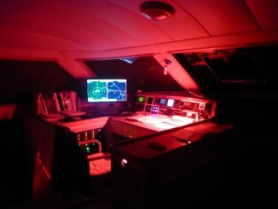 Ich sitze am Kartentisch und bemerke plötzlich – links neben mir – das Aufflackern einer roten Warnblinkleuchte. Genaueres Hinsehen lässt mich die BB-Motorraum-Bilgenpumpe erkennen.