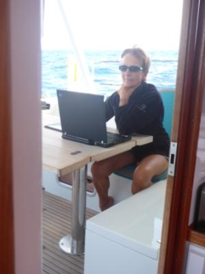 Als ich morgens aus der Koje klettere, finde ich Peter bereits auf der rasenden Gartenbank, um die PIA von Hand zu steuern. Hohe Wellen und 7 Windstärken machen der automatischen Windsteuerung Probleme. Die PIA saust zwar wieder mit 15kn (in Surfs mehr) durchs Wasser aber der Kurs ist heikel und die PIA surft – der Welle folgend – in schwungvollen Bögen.