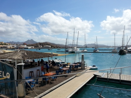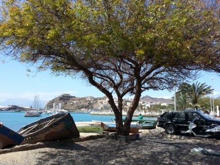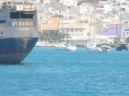 Über die Bugspitze schauend leuchtet uns Mindelos Uferpromenade mit ihrer freundlichen, pastellfarbenen Bebauung entgegen. Der Blick nach hinten schweift zwar über herrlich türkisfarbenes Wasser, offenbart aber – mit den darauf schwimmenden, von Rost zerfressenen Frachtschiffen – eher trübe Aussichten, was Frank (auch im Hinblick auf die bevorstehenden Reparaturaufgaben) spöttisch kommentiert: „Ja, guckt Euch nur mal um! Das wird dann wohl unsere Heimat für die nächsten zwei bis drei Monate sein.“