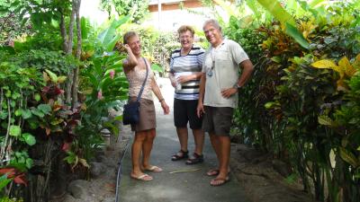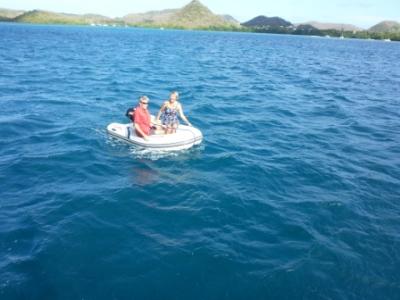 Frank fragt über Funk, ob wir der persönlichen Einladung des Chefs der ersten Hütte (der mit seinem Dinghi bereits zur Obelix gedüst ist) folgen sollen. Natürlich! Für uns vier(die einzigen Gäste) wird allerfeinst gekocht: Gegrillter Fisch, Ribeye-Steaks, gegrillte Hähnchenspieße, Lambi-Muschel-Eintopf, überbackene Auberginen und Kartoffeln, gebratene Bananen, Reis…