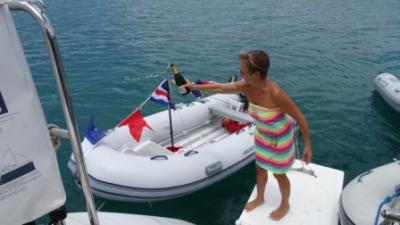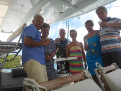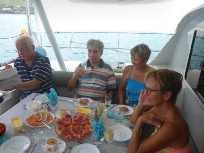 Funkruf vom just eingetroffenen Frank: Wir haben einen Bonito geangelt und bereits filetiert. Wollen wir Sushi essen? Klar! Rüber zur Obelix mit einer Flasche Sprudelndem aus der Champagne.