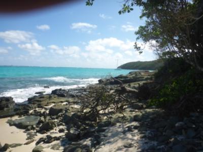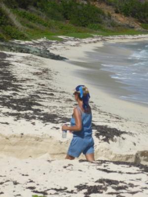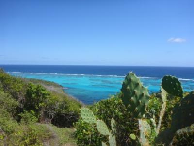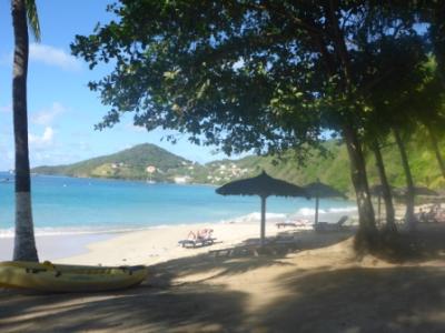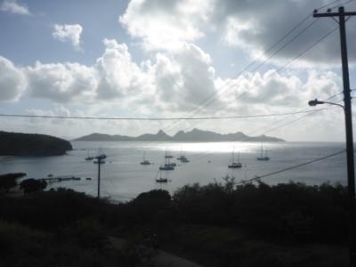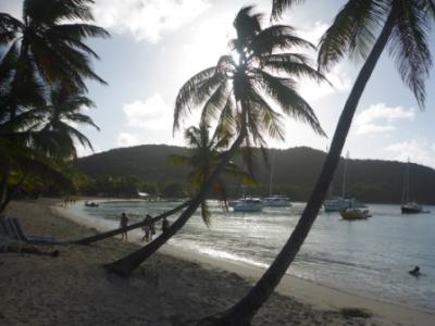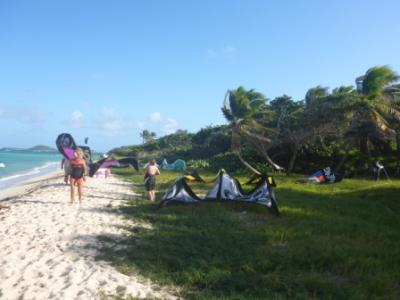Ein Spaziergang über den Inselberg weht würzigen Kräuterduft in die Nase, zeigt frisches, üppiges Grün allüberall, gewährt herrliche Ausblicke auf die umliegenden Inseln und bringt uns schließlich in die, im Norden gelegene Saltwhistle Bay, die durch einen schmalen, Palmen-bestandenen Landstreifen von der Luvseite der Insel getrennt ist. Auf dieser Seite: etwa 30 Kitesurfer.