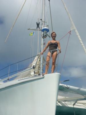 „Und ihr seid etwa – all the way down – gesegelt??? Über den Atlantik??? Zwölf Tage ohne Unterbrechung?? Tag und Nacht… ihr könnt auf dem Schiff schlafen? (Ist das der Zweifel am Vorhandensein einer geeigneten Schlafkoje auf so einem kleinen Katamaran oder an der psychischen Stabilität der Eigner, in einer solchen Situation überhaupt schlafen zu können?) (Insgeheim warte ich auf die Frage: Ohne zwischendurch zu ankern ? Aber die kommt nicht. Da kennen sich die Ladies wohl aus…) Ja und euer Motor? Die Frontfrau deutet auf den Außenborder, der am Heck angebracht ist. „Nein, das ist der Motor fürs Dinghi.“ In jedem Rumpf befindet sich ein Motor für den Cat.