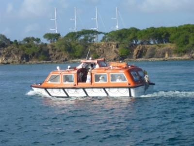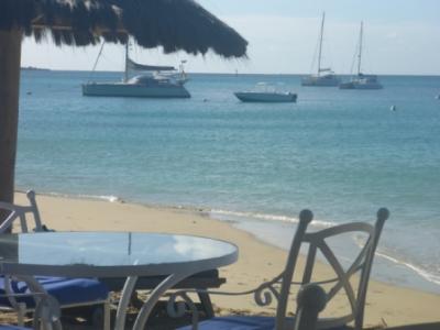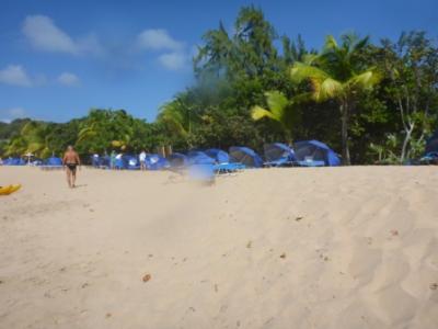 Ein Rettungsboot nach dem anderen tuckert aus der Nachbarbucht herbei und entlädt die Exclusiv-Urlauber am Dinghi-Steg. Wir staunen nicht schlecht, als wir erkennen können, was sich während unseres Morgenplausches am Strand so alles getan hat: Etwa 30 königsblaue, große Sonnenschirme sind – eher als Windschutz – mit der Öffnung zum Strand hin, schräg in den Sand gesteckt, königsblaue Liegen mit matt-golden schimmernden Füßen und farblich passenden Strandlaken warten auf die Benutzer, die Strandbar, ein weißes Zelt, hält alles für den Durstigen bereit und die Klänge der Steelband überziehen angenehm die Bucht.