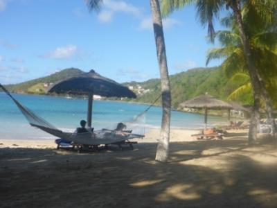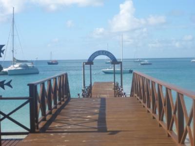 Wir laufen in die Charlestown-Bay von Canouan ein. Boatboy Shem – mit einem breiten Zahnlücken-Lächeln und strahlenden Kulleraugen – rauscht heran und fragt, ob wir ankern wollen oder eine Boje haben möchten. Wir wollen die „Behindertenboje“, in unmittelbarer Nähe des Dinghi-Docks, da wir ja „Außenborder-amputiert“ sind und mit möglichst geringem Paddelaufwand an Land gelangen möchten. Wir bekommen sie. Vor uns das Willkommensschild des Tamarind Hotels, links davon der gepflegte Hotelstrand (der übrigens jeden Morgen mit großen Rechen von Seegras befreit wird) und die Strandbar.