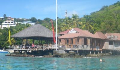 Wir betrachten die Insel am ersten Abend lediglich vom Schiff aus. Aus der berühmten „Basils Bar“, die unmittelbar vor unserer Nase auf Pfählen ins Wasser gebaut ist, dringt munteres Geplapper und leiser Jazz zu uns herüber.