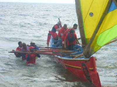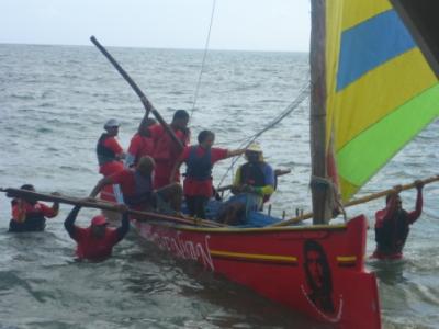 Just zur Vorspeise passiert es. Die Wende an der Boje misslingt, das Segel killt, die jungen Männer versuchen das Boot mit heftigen Ausgleichsbewegungen wieder auf Kurs zu bringen aber scheitern. Einige fallen ins Wasser, machen Klimmzüge an den langen Auslegern, um wenigstens das Boot in der Balance zu halten, müssen aber schlussendlich aufgeben und landen unmittelbar vor unserer Nase am Strand. Enttäuschte Gesichter bei den Sportlern beim Abriggen ihres Regattabootes aber (gemeinerweise) Kamerafutter für die Touristen.