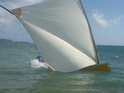 Und: Wir haben Kino vom Feinsten, denn in Le Marin ist am Vormittag die Regatta der „Yoles“ gestartet, die einen Wendepunkt nicht weit von unserem Restaurant hat. Die „Yoles“, traditionelle, etwa 11m lange Segelboote (mit quadratischem Segel, diagonal durchgeführtem Baum und ohne Kiel) sind besonders schwer zu manövrieren. Sie werden von einer 9 -11 köpfigen Crew (ein Steuermann) in der Balance gehalten, indem sich die allesamt durchtrainierten Männer mit halsbrecherischen Ausreitmanövern an langen Stangen, mal Backbord, mal Steuerbord übers Wasser hängen, um möglichst schnell und ohne zu kentern vom Segel vorangezogen zu werden.