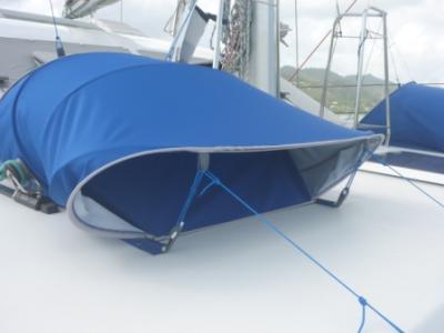 – Doorcaps (eine Art mobiles Schutzzelt) über den beiden großen Luken der Schlafkojen montiert, damit letztere am Ankerplatz immer (auch bei Regen) offen bleiben können und somit für eine perfekte Ventilation der PIA sorgen können.