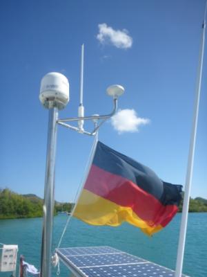 Unser Boatboy: Ein Europa-Fetischist… Die Schweiz auf der Brust, die Deutschlandflagge (ein Geschenk von uns) schwenkend, braust er stolz davon…
