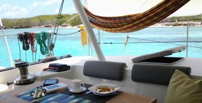 Ein Ankerplatz ist bald gefunden, wir sitzen am Kaffetisch und …gleiten sachte, sachte am neben uns ankernden Katamaran vorbei. Das passiert halt manchmal, wenn der Anker nicht hält.