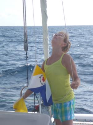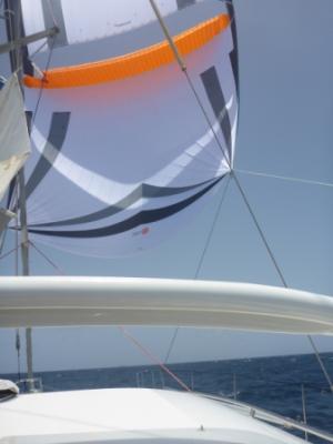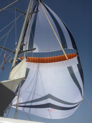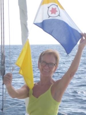 Nach dem Abendessen wird’s spannend. Die Navigation zeigt noch 3Std. bis nach Bonaire an, d.h. wir werden bei absoluter Dunkelheit, zwischen 23.00h und 0.00h die Südspitze von Bonaire erreichen. Sicherheitshalber aktivieren wir das Backup, die „Open Sea“ Karten auf dem Laptop, falls der Navi-Bildschirm wieder ausfallen sollte und halten angestrengt Ausschau nach den angegebenen Leuchtfeuern. Sehr spät erst lässt sich das Leuchtfeuer an der Südspitze Bonaires erkennen, an der wir den Parasailor bergen wollen. Als es endlich erscheint, gibt’s als Gratiszugabe starke Windböen, die die PIA impulsartig auf 10kn beschleunigen. Na, bravo! Den Spaß hätten wir gerne ein bisschen früher gehabt! Jetzt soll er in die Tüte, d.h. in den Bergeschlauch. Wir starten die Stb.-Maschine, laufen vor dem Wind ab, fieren Stb.-Schot und Niederholer und können so –bei nur noch 6kn scheinbarem Wind – in perfektem Teamwork und punktgenau dieses blähfreudige Segel in den Bergeschlauch ziehen.