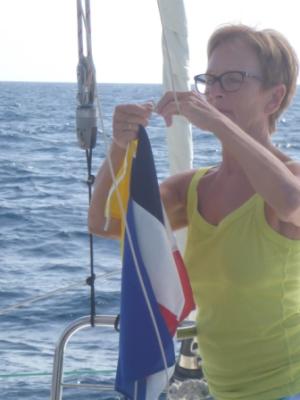 Danach ist Bordreinigung angesagt. Etliche Fliegende Fische haben ihren Höhenflug nicht überlebt und sind – dummerweise an Bord und im Trampolin gelandet. Erstens: tot und angetrocknet, zweitens: klein, drittens: wahrscheinlich ziemlich grätig, lassen sie uns nicht auf die Idee kommen, sie in einen Gaumenschmaus zu verwandeln aber erinnern uns daran, dass wir ja noch eine Angel haben, um möglicherweise besseres zu fangen.