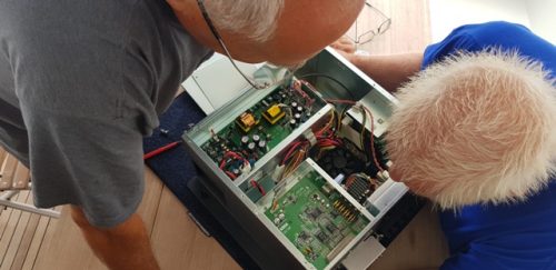Hier beim Zerlegen des ehemals Allerheiligsten der Navigation, des Furuno-Computers… ein exclusives, wunderschönes Stück Schrott, dem die Spätfolgen des Blitzes von Teneriffa letztendlich (und kaum sichtbar) den Todesstoß versetzten…