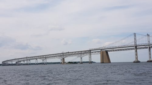 Ab ca. 14.00h können wir die große Brücke erkennen, die Ost- und Westufer der Chesapeake Bay miteinander verbindet. Uns fällt ein, dass wir uns ja unmittelbar nach dem Verlassen eines Staates beim darauffolgenden anmelden müssen. Gestern haben wir Virginia verlassen, also sollten wir uns schleunigst in Maryland anmelden.