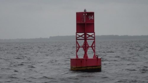 Wir haben Zeit verloren und müssen unsere Geschwindigkeit auf 8kn erhöhen, wenn wir Georgetown noch vor Dunkelheit erreichen wollen. Außerhalb des Fahrwassers – wo wegen geringerer Strömung das Vorankommen leichter ist – lauern Fallen in Form von „Crab Pots“. Das sind versenkte Krabbenkörbe, mit denen man hier die Spezialität der Region, die köstlichen Blue Crabs fängt. Kleine weiße Bojen markieren den unter ihnen befindlichen Crab Pot und sind mit selbigem über eine Leine verbunden. Eine solche Leine im Propeller würde uns zu unserem Glück gerade noch fehlen! Wachsamkeit ist gefragt. Dem GPS können wir nicht mehr vertrauen. Er fällt immer wieder aus oder springt von rechts nach links.