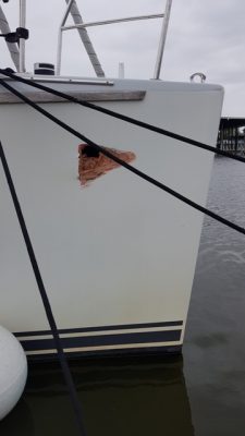 Die Inspektion zeigt Scheußliches: Lateraltonne L94 hat ein pfeilförmiges Loch in den Bug gerissen, um danach – sich schwankend drehend – ein zweites Mal (mit dem Sockel) in die Flanke der PIA zu krachen…