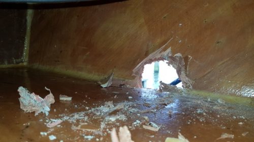 Als Wut, Ärger und Zittrigkeit nachlassen, machen wir uns daran, das Loch zu verschließen. Ausstopfen mit Folie und Tüchern und Zukleben mit der amerikanischen Wunderwaffe: Duct Tape…(reichlich erprobt während unserer Camperreise zum Abkleben diverser Undichtigkeiten am Wohnmobil)