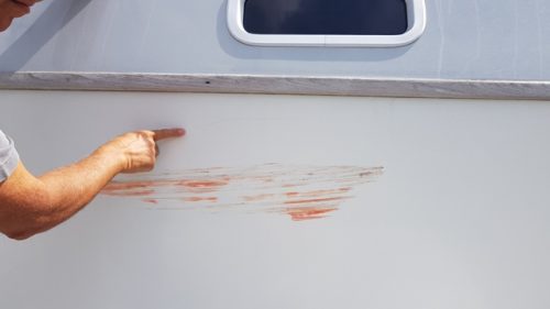 Einmal im Wasser verlangt er nach einem Spatel, um mit dem Entfernen des dicken Bewuchses an der Wasserlinie zu beginnen. Die Arbeit in der starken Strömung ist äußerst mühsam, da er sich mit einer Hand an der Leine festhalten muss, um nicht abgetrieben zu werden und mit der anderen Hand den hartnäckigen Bewuchs regelrecht abstoßen muss.