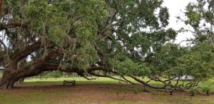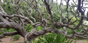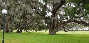 Ein Wald mit Palmen unter weit ausladenden, moosbehangenen Lebenseichen, umwucherten Pfaden,