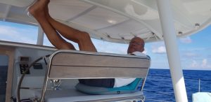 Surfen auf achterlicher Welle bedeutet Hochgenuss; aber diese kurzen, steilen Wellen, die an die Seiten klatschen oder mit der Wucht eines Vorschlaghammers unters Brückendeck, vermitteln den Eindruck, auf einem bockigen Rodeopferd zu sitzen. Dazu dieser unerträgliche Lärm von Geschirr, das in den Schränken hin und her rutscht, Flaschen, die in ihren Holzgittern rumpeln, Gewürzgläser, die klirrend von einer auf die andere Seite fallen. Küchentücher, zwischen die umher rutschenden Teile gestopft, regulieren die Dezibel ein wenig runter.