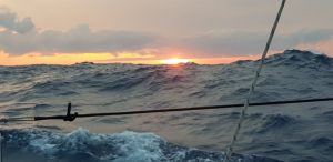 Die zweite Nacht auf See ist wieder ziemlich ungemütlich. Als ich um 4.00h die Wache übernehme ist es stockdunkel. Kein Mond am Himmel, keine Sterne. In ziemlicher Entfernung zucken – rund um uns herum – die Blitze ins Wasser. Dabei wird der Horizont sekundenweise gespenstisch erhellt.