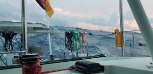 Als die Sonne untergeht, schaukelt sich die See allmählich auf. Wellen aus NNE treffen kurz, ungeordnet und hart in einem 45° Winkel auf die Bugspitzen der PIA. Der Wind schiebt dagegen. Das ist kein Kurs für einen Katamaran!