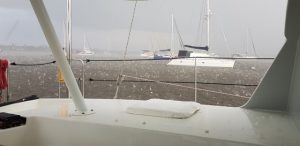 Das Ende vom Lied: Nach der Rückkehr zur PIA hat Deutschland 2:1 gegen Schweden gesiegt, im Dinghi haben sich ca. 100l Wasser gesammelt, die Polster im Cockpit sind triefend nass, die Betten auch.