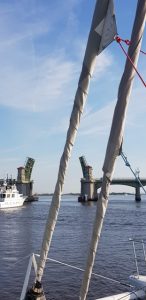 Am nächsten Tag wird’s spannend. Können wir die vor uns liegende Brücke bei Niedrigwasser passieren oder müssen wir den ca. 20sm langen Umweg machen, um wieder auf den Atlantik zu gelangen? Gestern hat Peter bereits bei Niedrigwasser (am Wasserpegelanzeiger unter der Brücke) die Brückendurchfahrtshöhe gemessen, indem er – vom Dinghi aus – den Abstand der 66ft-Marke zum Wasserspiegel gemessen hat. 1.50m, d.h. ca. 5ft, was bedeutet, dass die Durchfahrtshöhe bei Niedrigwasser 71ft haben müsste. Wenn also alles so passt – wie gemessen – können wir die Brücke mit einem Abstand von 2ft zur Mastspitze unterqueren.
