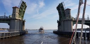 Wir befahren zum ersten und einzigen Mal einen Abschnitt des ICW (IntraCoastalWaterway), da alle Brücken, die wir unterqueren müssten, mit 65 ft, d.h. (65ft) eine – für den Mast der PIA (69ft) – zu geringe Durchfahrtshöhe haben.