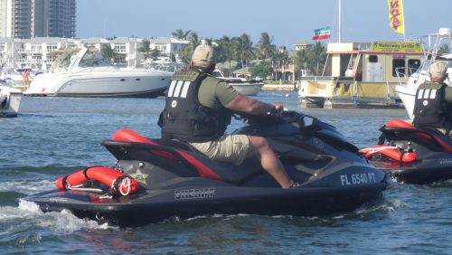 Sheriffs patroullieren zu Wasser und in der Luft und greifen ein, wenn es zu laut wird oder übergriffig. Wir sitzen auf der Obelix in der allerersten Reihe und können das Spektakel – fast mittendrin – genießen.