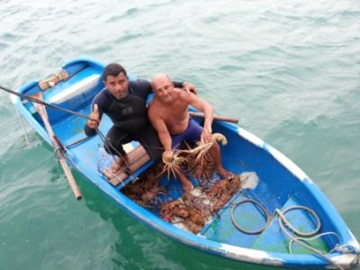 Das Ankermanöver ist gerade abgeschlossen, als bereits die ersten Fischer heranfahren, um ihre Lobster zu präsentieren.