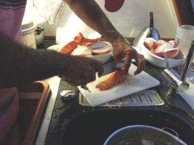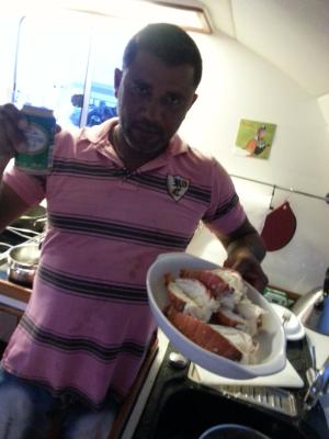 Die Fischer holen ihre drei Kollegen, die noch auf dem Mutterboot sind, ab und kommen mit allen Zutaten zu einem leckeren Abendessen wieder. Fünfzehn Lobster werden vorher noch in meinen größten Topf gesteckt mit der Anweisung, sie 10min kochen zu lassen…