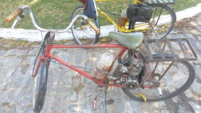 Nehme ein Fahrrad und mache ein Mofa daraus, indem du den Motor einer „Stihl“-Kettensäge anbringst…
