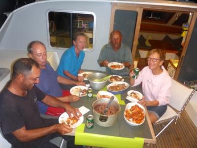 Dann steigen sechs Männer an Bord, eben noch in Stiefeln und Fischerklamotten, nun im adretten Ausgehzwirn. Eine große Schüssel Krautsalat und ein Topf mit dampfendem Reis und roten Bohnen wird auf den Cockpittisch gestellt.