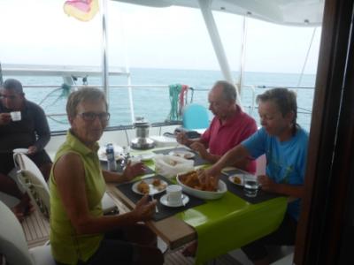 Keine Frage: zum Apero oder Sundowner eine Delikatesse; aber zum Frühstück treibt unser westeuropäischer Magen doch deutliche Fragezeichen in die Gesichter. Dennoch verspeist jeder einen Fisch mit genussvollem Gesichtsausdruck und niemand muss es bereuen.