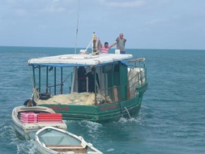 Das „Unheil“ verlangsamt die Fahrt, bleibt in respektvollem Abstand zur PIA und wird von Peter bereits begrüßt. Keine Piraten! Einer von drei sehr ärmlich wirkenden Fischern hält bereits einen Lobster hoch. Peter nickt. „Wie viele wollt ihr“? „Einen“. „No, No!“ Er hält drei große hoch.