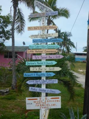 20 Häuser, eine Bar, eine Kirche, ein Convenient-Shop, eine Polizeistation, 127 Einwohner. Der Polizist kommt just in dem Moment, als wir vor der Polizeistation ankommen. Superfreundliche Begrüßung, wir erklären unser Problem, das er als keines betrachtet, fotografiert unsere Reisepässe, die Bootspapiere, sagt uns, dass wir uns frei auf jeder Insel bewegen dürfen und in George Town einklarieren und das „Cruising-Permit“ kaufen sollen.
